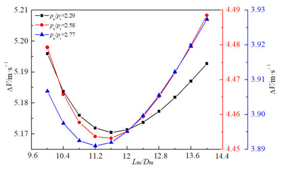 According to the above analysis, an optimization method of mixing chamber length is now investigated. We keep the diameter of the mixing chamber and other operating parameters unchanged as per experimental tests in [26,30]. The length of mixing chamber Lm is calculated under different expansion ratio pp/ps. Figure 10 shows the relationship between the velocity difference of two fluids at the mixing chamber exit and the length–diameter ratio of the mixing chamber Lm/Dm. It can be seen from Figure 10 that when the ejector expansion ratio remains unchanged, the velocity difference ∆V decreases first and then increases with the increase in the length–diameter ratio of the mixing chamber Lm/Dm. When the velocity difference between the two streams is the smallest, the two fluids are mixed more fully at this time, and the corresponding mixing chamber length is considered to be the optimal value. In the calculation range, when Lm/Dm is about 10.8–12, the exit velocity difference of the ejector mixing chamber is the smallest, and the mixing uniformity is better. Ref. [34] has recommended the Lm/Dm to be 5–10 from the perspective of ejector efficiency. Ref. [35] found the maximum value of entrainment ratio when Lm/Dm was near to 6.1. There are differences between the literature values and the present results, and this is mainly because of the diversity of working conditions and optimization objectives. In this present range, it is more favorable to mix with uniformity.