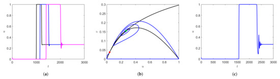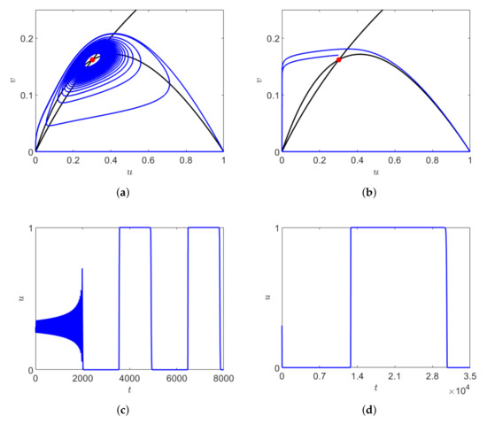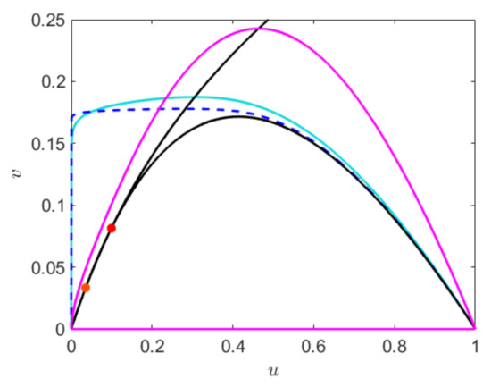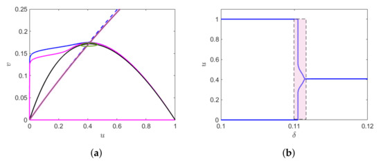 where the dimensionless variables u and v are prey and predator density, respectively, at time t, and is the time scale parameter [13,14,15,16]. The solution of (1) is composed of the slow and fast motions for ), which are obtained by decomposing the above system into fast and slow subsystems, respectively, as follows