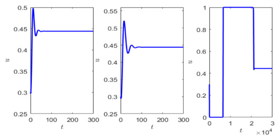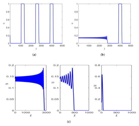 For , the system has two coexistence equilibrium points where is the saddle point and is stable focus. Starting from initial point close to , with decreasing the duration of transient dynamics increases and the system stays near the origin for a longer time. Here, the long transient arises due to the crawl-bys behavior of the saddle point and and also due to the slow growth of the predators. With decreasing , the trajectory approaches the saddle point through a trajectory passing through the close proximity of the stable manifold, where the system spends a longer time and the chaotic oscillation increases before converging to . This is another example of long transient. The solution of system (1) obtained for three different values of is shown in Figure 8a for and The phase space trajectory and the corresponding dependence on time obtained for and are shown in Figure 8b,c, respectively.