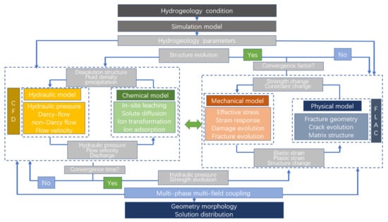 On the other hand, the algorithms and mathematical model contribute to visualization of the geochemical-physical coupling process [35,36,37,38]. Rutqvist presented a linked multicontinuum and crack tensor approach for modeling coupled geomechanics, fluid flow, and solute transport in fractured rocks [39]. Lei reported a stress-induced variable aperture model to characterize the effect of polyaxial stress conditions on the fluid flow in 3D persistent fracture networks and performed the geomechanical modeling of the fractured rock by the finite-discrete element method (FEMDEM) [40]. Zhao presented a closed-form solution for modeling the coupled stress–flow–transport processes along a single fracture embedded in a porous rock matrix [41]. Crandall related the macroscopic roughness parameters to the effective flow through fractures, examining the relationship between wall roughness and fluid flow in rock fractures [42]. Akhavan quantified the effects of crack width, tortuosity, and roughness on the water permeability of cracked mortars [43].