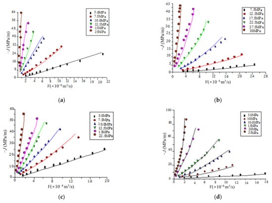 In order to determine the flow state in a rough-walled fracture, the Darcy flow, non-Darcy flow, and turbulent flow subjected to changes in hydraulic gradient and fracture geometry were considered. The Forchheimer equation, given in the form shown in Equation (11), has been widely used as the empiric and theoretic formula to describe the flow behavior in porous media and rock fractures [15].