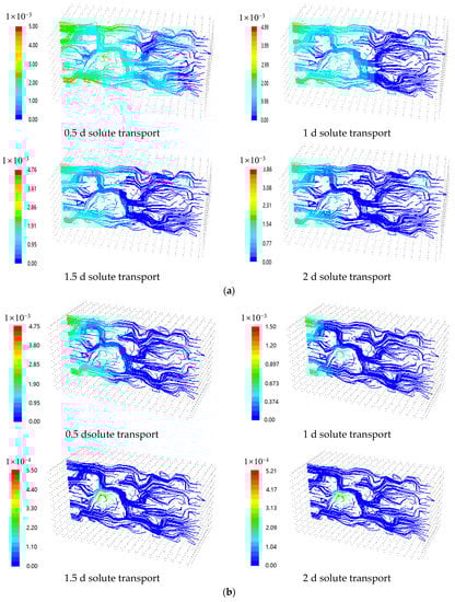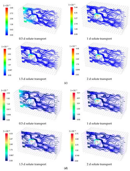 Fracture solute transport condition under different hydraulic pressures: (a) hydraulic pressure of 0.5 MPa, (b) hydraulic pressure of 1.5 MPa, (c) hydraulic pressure of 2.5 MPa, (d) hydraulic pressure of 3.5 MPa.