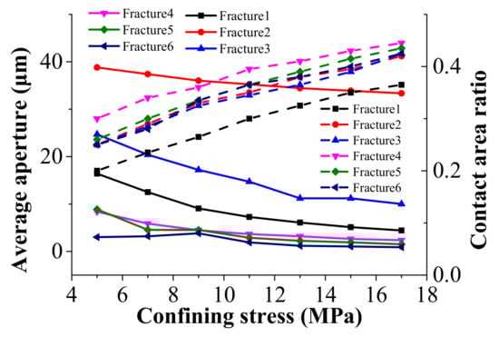 The different magnitude changes in contact area and fracture aperture occurred. In more detail, the larger contact area is associated with a smaller aperture, and dynamic fracture closure is presented in a larger initial aperture fracture.