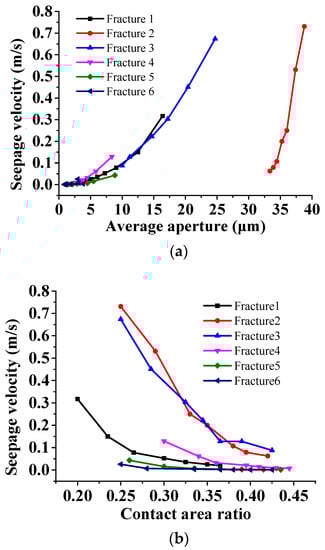 In addition, for a certain contact area ratio, the seepage velocities of fracture2 and fracture3 were 5–8 times those of fracture1, fracture4, fracture5, and fracture6. On the other hand, the contact area ratios were different for all fractures, and fracture1 had small initial contact area ratio, and fracture4 had a large initial contact area ratio. The contact area ratio and fracture tortuosity also influenced the distribution of the connected voids, leading to differences between the seepage velocities of fracture1 and fracture2, thereby indicating that the average aperture is not the only factor dominating fracture seepage.