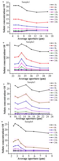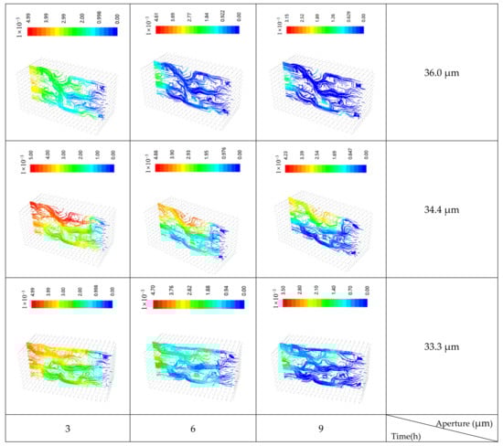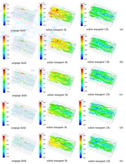 Figure 10 shows that the solute concentration changes with an increase in the average aperture, and an increment of 1 × 10−4 to 5 × 10−4 was observed for an increment of 2–5 μm in the average aperture; then, the solute concentration decreased by 1 × 10−4 to 10 × 10−4 in the following increment of 5–10 μm in the average aperture was observed. These observations imply that there exists a threshold in the fracture for the transportation between the lower and higher solute concentrations. The dynamic migration of the uranium-containing solute was presented in the early 12 h, and the migration seepage generally slowed in the later 12 h.