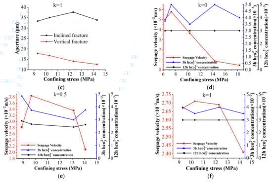 Relationship of the confining stress, aperture, seepage velocity, and concentration in different loading conditions. (a) confining stress for a k = 0, (b) confining stress for a k = 0.5, (c) confining stress for a k = 1, (d) the seepage velocity for a k = 0, (e) the seepage velocity for a k = 0.5, (f) the seepage velocity for a k = 1.
