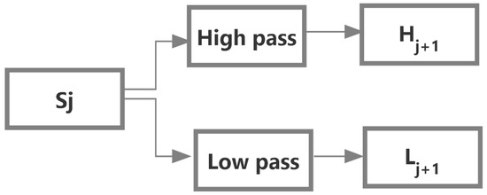 where and are the impulse responses of low-pass and high-pass mirror filters. The jth level of decomposition is shown in Figure 1. The decomposition formulas of NDWT are as follows: