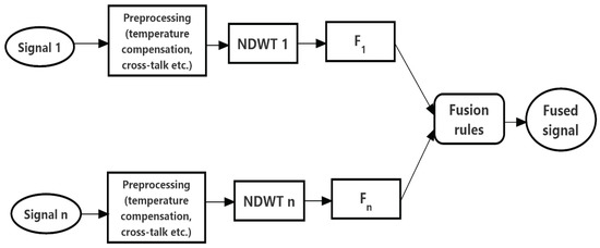 Figure 2 illustrates the proposed methodology for signal level fusion, which is composed of three stages, namely, preprocessing, NDWT, feature extraction, and feature fusion. The preprocessing stage is divided into two steps: remove temperature effect, then cross talk and normalization. In the first step, the temperature effect was detected from input signals with the help of general baseline subtraction. In the second stage, the normalization of the signal in a proper manner is performed in order to align the signal for fusion. The process of feature extraction is shown in Figure 2. The preprocessed signal is firstly decomposed into different sub bands using NDWT as shown in Section 2.1. The types of wavelet and their order have crucial influence on the effectiveness and accuracy of change/damage detection during the analysis. However, there are no strict rules for the selection of wavelets for damage or change detection in SHM. In previous studies, the author has shown that low-order wavelet gives the best results [35]. Therefore, we selected a low-order biorthogonal wavelet to extract features from the signals. With the level L and wavelet selected appropriately, based on NDWT coefficient sets, , , the principal features at different scales were extracted. Therefore, the characteristics of changes (damage) in both geometric locations in the material were preserved and transformed into NDWT domain. Let the two ultrasonic signals from two pairs of sensors be and , and F will be the the fused signal. Simple fusion rules were applied to these coefficients.