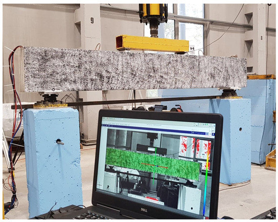 To perform the four-point bending test, the hydraulic jack and a load cell ZR DIORA®—model 25 set to transfer two-point force (Figure 3) were mounted in middle of the beam. To maintain a controlled schedule, an analogue controller was used to operate the loading machine. Since the main purpose of these studies is to evaluate the proposed fused signals for cracks evolution and the damage level with the increasing load using ultrasonic techniques (see Figure 4), we are presenting also the force and deflection. The loading schedule was steady at the beginning on 1 kN/min till 108 kN, and then schedule changed to 5 kN/min (Figure 5), that initiated suitable stress/strain state in the tested RC structure.