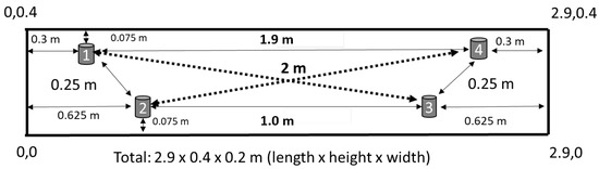 During the preparation of the benchmark RC beam, the sensors were concreted. The embedded ultrasonic sensors were attached with a special ring connected with rebar, and vibrating wire strain gauges were attached with top and bottom reinforcement. These new ultrasonic sensors specially suitable for RC structure for monitoring purposes (see [18] for more details), were attached on four vertical stirrups. The position of ultrasonic sensors are shown in Figure 4.