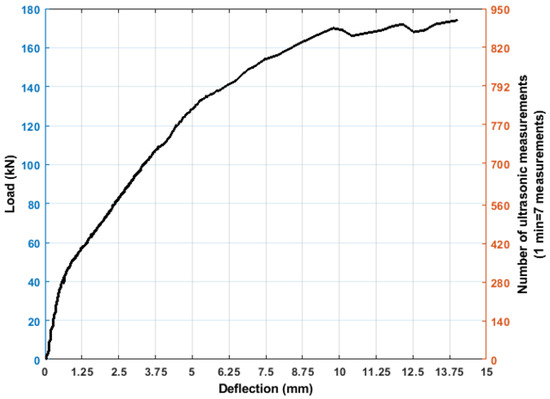 The data acquisition from ultrasonic measurement system was made seven times per minute and customized software used to store the acquired signals in the local disk (for more information see [36]). During the loading schedule, ultrasonic waves were transmitted and propagated through the benchmark RC structure (e.g., sensor 1 transmitted the signal, and, after propagation, sensor 2 registered that signal). Figure 5 shows the loading schedule and deflection corresponding to number of ultrasonic measurements. It can be observed that cracking initiated around at 42 kN.