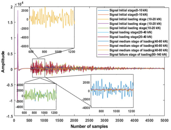 The examples of the ultrasonic signals acquired from sensor pairs 01 and 03 are shown in Figure 6. It can be seen that at the initial stage, no significant differences were visible in the measured time signals (e.g., for the interval of 0–10 kN). Then, the amplitude started to decrease with the increase of the external loading.