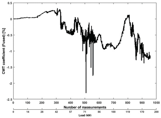 To evaluate the fused signal, CWT feature is extracted from the fused signal time histories. From Figure 10, it can be observed that the coefficient decreases with the bending as the level increases between 30 kN to 40 kN in the beam. Then coefficient was fluctuating due to energy attenuation, which indicated microcracks. The coefficient was much more steady compared to results from both pairs of sensors, which reduces the false alarm rate. As depicted in Figure 10, the fused signals based on averaging rules enhanced the damage detection to some extent.