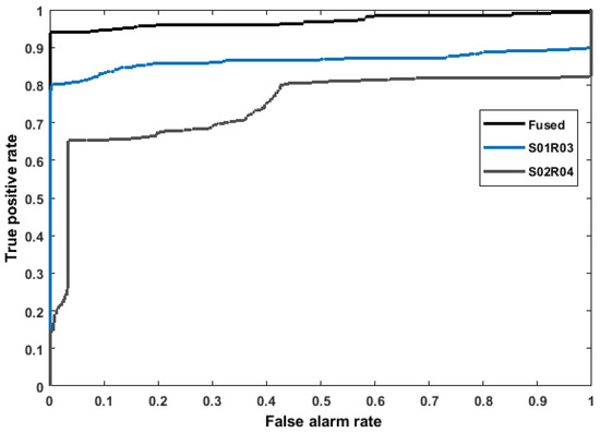 The performance of these features is analysed also using ROC curve (for more information see [41]). For each of the features, a predetermined threshold is swept over the range of the feature values of each of the transducer pairs (computed at several times in the experiment), and the probability of detection (true positive rate) is plotted versus the false alarm rate (FAR). A perfect detector, one that calculates the features accuracy to classify the two states, measures the value area under the curve (AROC). The CWT features from the ultrasonic signals (for both pairs) are compared with the fused signal in Figure 11 via their ROC curves. The results indicate that all the features performed well in their capability to detect crack opening and propagation as well as several states in the appearance of noise. However, after using the proposed fusion algorithm, the coefficient performed better (AUC = 0.979 see Figure 11) to classify damage from the undamaged state in this benchmark structure. Since most of the cracks appeared in the middle part of the beam and few in the side, this result is not unexpected from the sensor pair S01-R03, because signals had strong effects compared to the signals recorded in the top pair (S02R04). After averaging the NDWT coefficients of ultrasonic signals by the baseline signal set, the crack information was highlighted more obviously than the other two pairs.