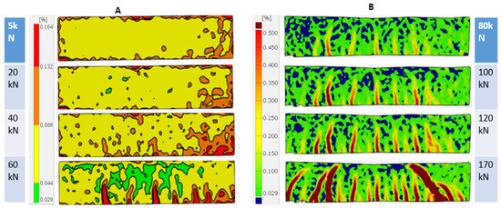 However, from the analysis of DIC results, the propagation of deformation is noticeable toward the direction of load. At 52 kN, cracks forming became observable by the naked eye. However, in the second stage (80–170 kN), the results of the DIC indicate crack propagation, and the formation of new cracks through different parts of the specimen (see Figure 12B) were not visible. Some of the cracks were not visible by the naked eye during the test. At 120 kN, all the cracks were visible, correlating well with the fused coefficient index.