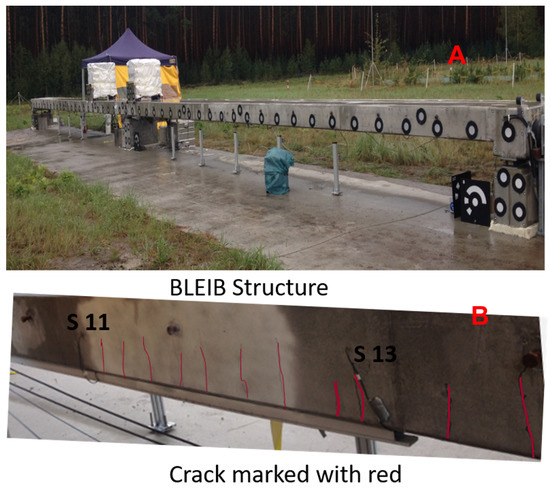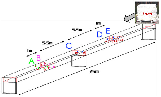 The purpose of the field test was to reveal the sensitivity of the presented fusion methodology to detect internal changes in the reference real structure (tensile and compressive stresses). The primary experimental object (BLEIB) was located in Horstwalde, Berlin, which allows us to demonstrate the real bridge, and reveal the sensitivity of our fusion methodology considering all the influences of a real structure [5,42]. The BLEIB object is a 25 m-long continuous beam (see Figure 13A). There are two cross sections. It was selected to detect the changes in real structure due to high static and dynamic loads. The embedded sensors (ultrasonic) were installed in both of the cross sections of this object during the erection period. The location of the sensors is marked in Figure 14. In this reference structure, a control crack was created to produce certain moderated damage in one of the beam. Therefore, during the load test, most of the cracks became noticeable between sensors no. 11–13, marked with a marker pen in Figure 13B. However, if the structure is reloaded, then all the cracks became closed.