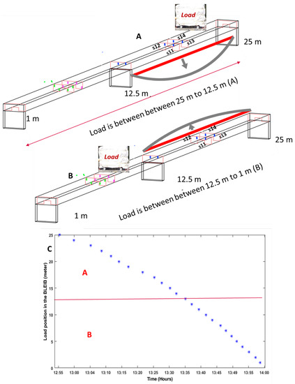 The aim of installing the sensors in this reference structure is to detect similar types of changes in the bridge due to quasistatic load. To assess the changes in this reference structure, a test load was performed. Four tons of load was used as a quasistatic load during the test (Figure 15). The load was slowly moved from one side, A, to another side of the structure, B. Therefore, the temporal change of the elastic parameters or microcracking in the influence area of structure could be detected.