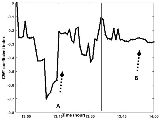 The interpretation of measured signals in the frequency domain was performed by the Continuous Wavelet Transform (CWT). The CWT function was used since CWT is an effective signal processing approach, used to detect changes/cracks in many applications due to its very high sensitivity to even tiny disturbances in the time-domain signal. CWT-based methods are used for the detection and localization of damages in many applications [37,38,39]. A CWT-based change matrix is developed to evaluate the changes in the structure and propagation of crack. The main procedures to compute the change/damage index matrix is the following: