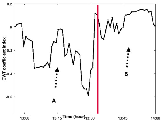 One can observe the results from both pairs of sensors. The evaluation from a single pair of sensors is not comprehensive, as pair S12-S13 do not indicate any signature of cracks, and S11-R13 show the crack opening but the coefficient does not increase even when the crack is closed. Therefore, it can be useful to use the proposed fusion methodology detailed in Section 2.1 to obtain a comprehensive result. The signal from both pairs of sensors is fused using fusion rules indicated in Figure 2. To evaluate the fused signals, CWT feature is computed from the same time histories. One can make three observations from Figure 18: the coefficient increases (load moves towards the sensors); then suddenly drops (load is on top of both sensor pairs) where the crack is visible; and the coefficient increases when the cracks are closed (specially load in cross-section B). From the CWT coefficient, one can observe the changes due to the tension and compression of the structure.