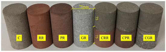 Before casting the pure concrete specimens and combined specimens, the internal surfaces of designed cylindrical metal moulds with an inner diameter of 75 mm have been fully smeared with lubricating oil to avoid adhesion. When casting the combined specimens, 75 mm high rock parts are first placed at the bottom of the metal moulds. Considering the practical engineering operation that the concrete structures are built on a geological body, the cement–aggregate–water mixture is then directly poured onto the upper surfaces of rock parts and compacted by placing the moulds on a vibrating machine. For a combined specimen, the heights of concrete and rock part are both 75 mm, i.e., the concrete–rock height ratio in combined specimens is equal to 1, and for a pure material specimen, the height of cylindrical concrete or rock is 150 mm. The specimens are taken out from the moulds 24 h after casting and then moist–cured in an environment of 20 ± 2 °C and 100% relative humidity for 2 months. Before conducting the uniaxial compression tests, the specimens are ground by using a polisher to make both ends of the cylindrical specimens parallel and smooth, and the errors of specimen dimensions are within ± 1 mm. Then the specimens are coated with grease to reduce the friction between the specimen and the rigid loading platens. For the current study, one type of pure concrete specimen, three types of pure rock specimens and three types of CRCSs are prepared as shown in Figure 1, and at least five specimens for each type are processed for testing. The specimen labels and combination forms are listed in Table 2.