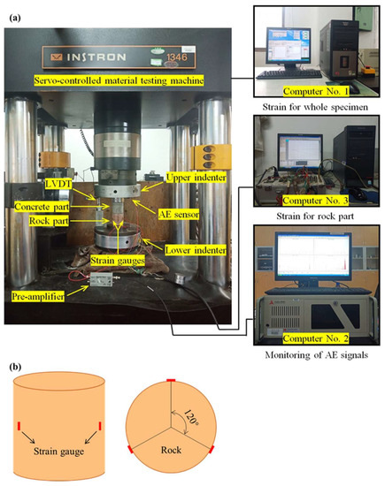 The whole experimental equipment mainly consists of three sub–systems, i.e., the loading system, AE monitoring system and the strain testing system as shown in Figure 2. The INSTRON 1346 servo–controlled material testing machine with a capacity of 2000 KN is used as the uniaxial compression loading system. The specimens are performed uniaxial compression testing on this testing machine with a displacement–controlled loading mode, and the loading rate is maintained at 0.15 mm/min. In current testing, the lower rigid loading platen is loaded upwards to exert pressure on the specimen while the upper rigid loading platen keeps stationary. A linear variable differential transformer (LVDT), which is directly connected to Computer No. 1 for signal processing, is used to measure the axial strain of the whole specimen. The PCI–2 AE detector, developed by PAC, is used to monitor AE signals during the loading process. The AE sensor is attached to the bottom surface of the upper rigid loading platen with a magnetic fixing device. To ensure the signal reception, Vaseline taken as a coupling agent is smeared on the interfaces and the AE sensor is placed as close as possible to the specimen. The AE signals are received and then amplified and transmitted to Computer No. 2. The main parameters for the AE detector are set as pre–amplifier gain 40 dB, threshold 40 dB and sampling rate 1 MHz, respectively. The DH3817 static strain testing system, consisting of strain gauges, a data–collection device and a computer, is used to measure the axial strain of the rock part. The strain gauges glued on the cylindrical surface of the rock part are directly connected to the data–collection device and the data–collection device is subsequently connected to Computer No. 3. To ensure the accuracy of measured strain data, three strain gauges separated by 120° are glued on the surface of the rock part for each combined specimen, as shown in Figure 2b. During the experiment, three specimens for each type are first tested, and if sharp contrast existed between the results, more specimens of this type are further tested until three similar results are obtained.