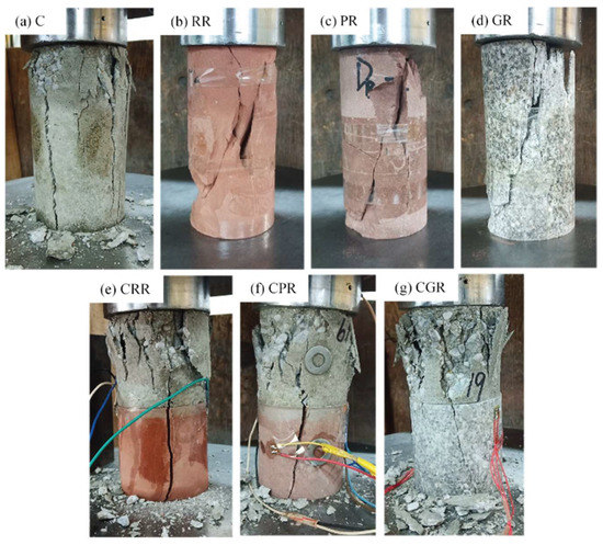 Furthermore, it can be found that the strain of the rock part in the combined specimen at peak stress is much smaller than that of the corresponding combined specimen. For instance, the average strains of rock parts (rock in CRR–1, CPR–2 and CGR–2) at peak stresses are 2.28 × 10−3, 1.90 × 10−3 and 1.47 × 10−3, respectively. The average strains of corresponding combined specimens at peak stresses are 3.91 × 10−3, 4.16 × 10−3 and 4.06 × 10−3, respectively. In other words, the axial deformations of rock parts at the peak stresses account for 29.16%, 22.84% and 18.10% of the corresponding combined specimens, respectively. Compared to the strains of pure rock specimens at the peak stresses (for example, 6.92 × 10−3, 6.46 × 10−3 and 5.55 × 10−3 for RR–2, PR–1 and GR–3), the axial strains of rock in combined specimens are only 32.95%, 29.41% and 26.49%. This is mainly due to the fact that the failure pattern of rock in the combined specimen is different from that of pure rock specimen under compressive loading. As mentioned in Section 3.1, the failure pattern of rock changes from a shear–induced fracture in a pure rock specimen to an axial tensile fracture in the combined specimen. Thus, it can be concluded that when the concrete–rock combined body is subjected to ultimate load, the concrete structure has a weakening effect on the axial load–bearing and deformation capacity of the connected rock foundation, and the weakening effect becomes more obvious with the increase of rock strength.