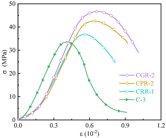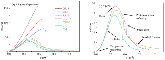 The main difference between the stress–strain curves of pure rock, pure concrete and combined specimens in the loading process is the post–peak strain–softening stage. Because of the brittle nature, the stress–strain curves of pure rock specimens can only be recorded a little later after the peaks. In contrast, due to being more ductile, the stress–strain curve of pure concrete specimen has good continuity and its post–peak strain–softening stage is relatively smooth. While in this regard, the CRCSs integrate both of the characteristics of the above two kinds of pure materials. Their stress–strain curves also present good continuity, but sudden stress drops appear at the ends of the post–peak strain softening stages when the rock in specimens are thoroughly fractured. Besides that, it is worth noting here that, with the increasing of rock strength in the combined specimen, the corresponding stress drop in the post–peak strain–softening stage delays. As mentioned in Section 3.1, this is again because of the horizontal tensile stresses generated by the axial cracks in concrete. When the higher strength rock is split, it needs more axial cracks of concrete to create enough horizontal tension to overcome its tensile strength, which means the corresponding combined specimen allows its concrete part to deform persistently along the loading direction with more axial strain.