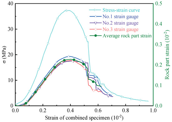 The axial strain of the rock part in the combined specimen is directly measured by using the strain testing system. Since the response behaviors of different rock parts in combined specimens during the loading are similar, here the stress–strain data of the rock part in CRR–1 (see Figure 5) is taken as an example for the analysis of strain variation of rock part. As can be seen, the axial strain variation of the rock part is similar to the stress variation of the corresponding combined specimen. Due to that, the strength and stiffness of rock are much higher than those of concrete, the rock part is almost intact before the fracture in concrete extends into it, during this period, according to the stress–strain curve in Figure 4a, the axial strain of rock in CRR–1 is still in the elastic stage, and a large amount of elastic energy is accumulated in rock part under the compressive loading. At the end of the post–peak strain–softening stage, the rock part is instantaneously fractured and a rapid axial strain recovery happens in the rock part. It is worth noting that the rapid axial strain recovery of the rock part and the sudden stress drop of CRCS almost happen at the same time. This phenomenon can be explained by the fact that when the rock part experiences a rapid axial strain recovery, the elastic energy accumulated in the rock part releases quickly and the rock part plays an axial loading role on the concrete part, which intensifies the failure of the concrete part, and as a result, the sudden stress drop happens in the CRCS. In addition, it can also be found from the figure that when the rapid axial strain recovery happens, the axial strain in the rock part and the stress in CRCS do not recover and decrease to zero, which indicates that the axial loading effect of the rock part cannot completely crush the concrete part, and the concrete part still has some residual strength.