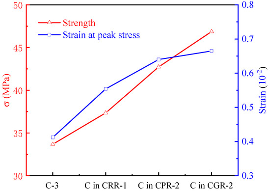 By substituting the strains of the rock part and corresponding combined specimen into Equation (3), the strain of the concrete part can be obtained. The stress of the concrete can be obtained by Equation (1). Because the whole combined specimen is near failed when the sudden stress drop happens, we only calculate the stress and strain of the concrete part before the stress drop happens. Figure 6 shows the stress–strain curve of the pure concrete specimen (C–3) and the derived stress–strain curves of concrete parts (concrete in CRR–1, CPR–2 and CGR–2). As can be seen, although the stress–strain curves of the pure concrete specimen and concrete parts show a similar evolution trend, several apparent differences can be observed from them. For instance, the strengths of concrete parts range from 37.35 MPa to 46.87 Mpa, and they are obviously higher than that of the pure concrete specimen (33.68 MPa). Moreover, the strains of concrete parts at peak stresses vary from 5.54 × 10−3 to 6.65 × 10−3, which are also much larger than that of the pure concrete specimen (4.12 × 10−3). Therefore, compared with the pure concrete specimen, the load–bearing and deformation capacities of the concrete part are both enhanced, and the strength and strain at peak stress of concrete parts also increase with the strength of the rock part. To illustrate these more clearly, the variations of the strength and the strain at peak stress of concrete and concrete parts are shown in Figure 7.