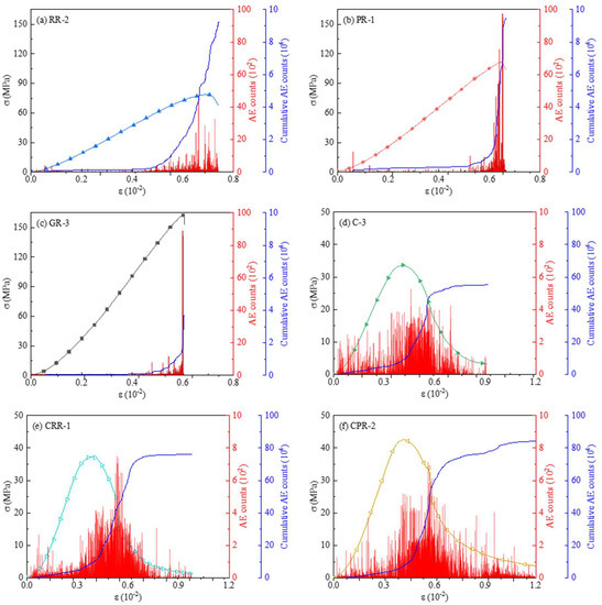 The AE signals (AE counts and cumulative AE counts) are monitored by using the PCI–2 AE detector to investigate the damage behaviors of the tested specimen. The AE detector runs simultaneously with the load–testing machine. Figure 8 shows AE counts and cumulative AE counts versus the stress–strain curve of each tested specimen. As can be seen from the figures, the variation of AE signals has a good correlation with the stress–strain curve. For all the specimens, at the beginning of loading, i.e., at the compaction hardening stage, due to the closure of micro pores and cracks, a small number of AE counts appeared, and then the AE activity was relatively quiet at the elastic deformation stage. When the plastic deformation stage is reached, the AE counts increase sharply, at the same time, the cumulative AE counts increase exponentially. The main differences of AE signals among these various types of specimens are that before the plastic deformation stage, the AE activities of pure rock specimens can be neglected, while due to the fact that concrete contains more pores, a number of AE events in pure concrete specimen and CRCSs are recorded. Moreover, because of the brittle nature, the AE signals of pure rock specimens can only be recorded a little later after the peaks, and due to being more ductile than rock, the AE events in the pure concrete specimen and CRCSs are active throughout the whole post–peak part. The peak values of AE counts of pure rock and concrete specimens appear near the peak load, while those of the CRCSs appear at the end of the post–peak soften stages where the sudden stress drop happens, and both mean the corresponding specimen is close to failing or failed.