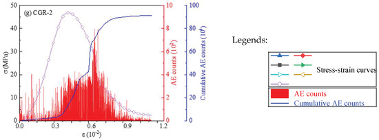 During the loading process, the crack propagation and extension cause damage to the specimen, and the AE events happen in the specimen. According to the principle of AE technology, the damage extent of the specimen after the test can be inferred by the final cumulative AE counts. The final cumulative AE counts of pure rock specimens (RR–2, PR–1 and GR–3) are 9.23 × 104, 9.45 × 104, and 3.67 × 104, respectively, and those of pure concrete specimen (C–3) and CRCSs (CRR–1, CPR–2 and CGR–2) are 5.52 × 105, 7.61 × 105, 8.44 × 105, and 9.13 × 105, respectively. The values of pure concrete specimen and CRCSs are much higher than those of pure rock specimens, and this indicates that the internal damage of pure concrete and combined specimens are more severe than those of pure rock specimens. Furthermore, by comparing the values of cumulative AE counts of pure rock and concrete specimens, it can be concluded that the AE events of the CRCS mainly happen in the concrete part, and this illustrates that the damage of the CRCS is mainly formed in the concrete part. Furthermore, it can also be found that the final cumulative AE counts increase with the rock strength in CRCS, and this means that the damage extent of the concrete part has a positive correlation with the strength of the rock part.