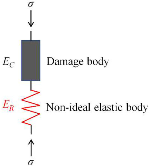 As mentioned in the foregoing analysis, the strength of concrete parts increases as the rock part strength increases, and the mechanical response of concrete parts is quite different from that of pure concrete. This is because rocks with different lithology have varying degrees of influence on the mechanical response of concrete parts. From this point of view, the above Equation (10), a traditional constitutive model for pure concrete, obviously cannot be used to accurately describe the behavior of concrete parts under uniaxial loading, and the influence of rocks with different lithology should be taken into consideration. At the beginning of loading, the concrete and rock parts are both in the compaction hardening process, but only a small amount of damage appeared in the rock, and the rock is almost in an elastic state before the sudden stress drop happens, thus the effect of rock part on the mechanical behavior of concrete part can be regarded as a non–ideal elastic body. In this way, the concrete in the combined specimen can be viewed as a cascade system of a damage body and a non–ideal elastic body (as shown in Figure 9) before the stress drop happens, and the constitutive equation for the non–ideal elastic body can be temporarily written as Equation (11):