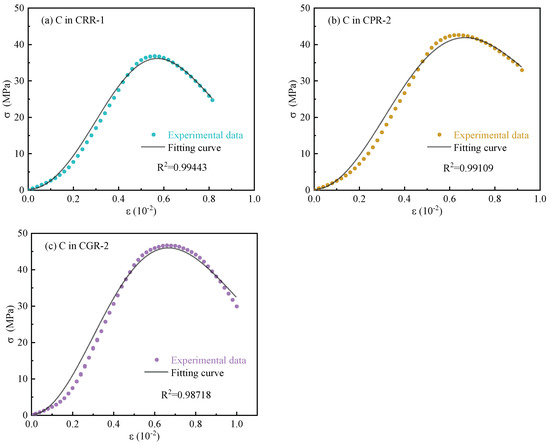 However, in the above establishment of damage constitutive equation, the compaction hardening process is not taken into account. As mentioned in Section 3.2, many micro pores and cracks exist within the concrete and rock, in the early stage of loading, these initial flaws in the combined specimen are rapidly compacted, and thus the stress–strain curve first starts with an obvious concave increase. To accurately express the characteristic of compaction hardening of the concrete part, a compaction hardening coefficient, α, is proposed to quantify the extent of compaction hardening: