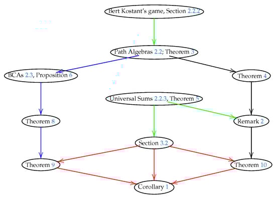 Figure 1 shows how Bert Kostant’s game, Brauer configuration algebras (BCAs), and mixed sums of triangular and square numbers are related to some of the main results (red arrows) presented in this paper regarding wargames.