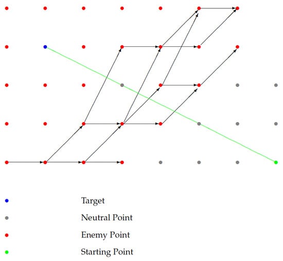 Recently, Tryhorn et al. [11] introduced a wargame associated with a combinatorial problem. According to them, a bomber crew navigates through enemy territory to reach an objective or target. The contested area is a tiled board. Each tile has a coordinate and an identifier of whether it is neutral, enemy territory, or the target. The goal of the bomber crew consists of reaching the objective without entering enemy territory and keeping it safe from surface to air missiles (SAM) sites. At least one path exists from the start point to the target satisfying the constraints. Finding the number of available paths is a discrete optimization problem (DOP), for which the length of the path is the cost function. The goal of this problem is to find an optimal solution , such that , for all . In general, DOPs are NP-hard problems. Figure 2 shows an example of this wargame scenario. In this case, directed paths are examples of how enemy’s launches can intercept the bomber. The green line identifies the shortest path to reach the target without the enemy’s detection.