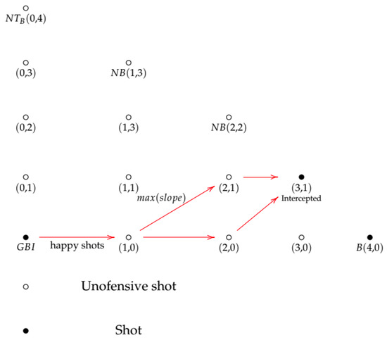 We follow arguments posed in the proof of Theorem 9 to establish that if , then each admissible path has associated a sum of three squares . Note that if belongs to a class , then , and if there is an admissible path with and , then there are non-negative square numbers , and , such that . Since or [] if is of the form or [], respectively. Then, there is no admissible path containing these types of points. In other words, any launch from to these types of points is unhappy. □