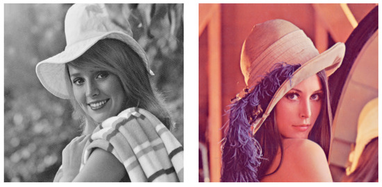 The grayscale secret image Elaine (left) and the color secret image Lena (right).