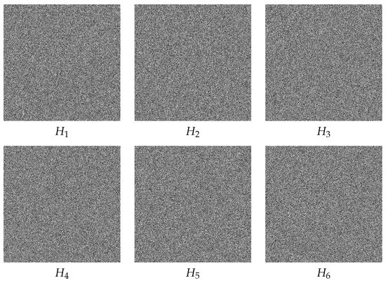 Note that when the 3-dimensional cat map of Equation (1) is used as the pseudorandom generator, the initial conditions, , consist of three double-precision real numbers and the control parameters, , are six integers. In this case, only the initial conditions of the maps used for (i) and (ii) above contribute six double-precision numbers to K. Thus, with a 64-bit double precision of , the size of the key space of K is at least , which is large enough to render exhaustive search attacks impractical.