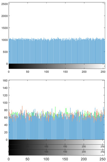 Figure 5 shows that the histograms of sample non-essential shadow image corresponding to the Elaine image and an essential shadow image corresponding to the Lena Image. It is evident that one cannot deduce any useful information about the secret image from the histogram of its corresponding shadow image. The histograms of the other shadow images possess similar behavior—hence, we omit them.
