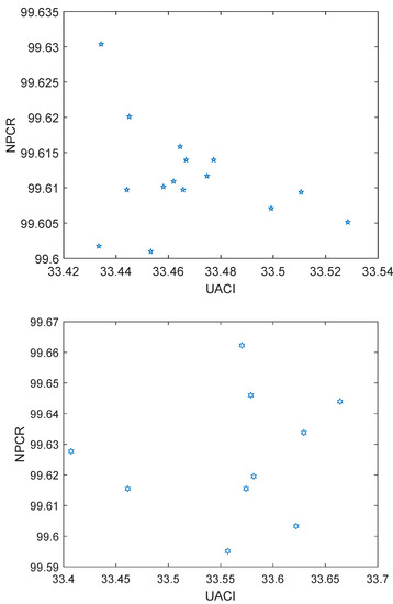 In addition to the STS results presented in Table 6, which confirm the randomness of shadow images generated by the proposed –ESIS scheme, we show that there is no similarity between any pair of shadow images. The number of pixels change rate (NPCR) and the unified average changing intensity (UACI) [32] are two of the most used measures to analyze similarity between a pair of images. Figure 6 (top) reports the NPCR and UACI measures for all possible pairs () of shadow images corresponding to the test image Elaine, and Figure 6 (bottom) reports the same for all possible pairs () of shadow images corresponding to the test image Lena. Each point in Figure 6 corresponds to a pair of NPCR and UACI measures for a pair of shadow images. It is evident that the reported measures are close to the ideal NPCR and UACI measures reported in [32], which are and , respectively. We conclude that the shadow images looks random in comparison with each other.
