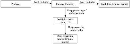 Fresh products will lose their desirability as a result of spoilage if there is a large inventory at the end of the selling season. Furthermore, the maturity of fresh products is mostly concentrated in the summer and autumn, and the freshness period of many fresh products is relatively short, which leads to fresh products that are not suitable for long-distance transportation to reach the target market. Therefore, it is easy to suggest the fresh products be listed in regional clusters, which further aggravates the imbalance between supply and demand for the fresh products. In the face of fierce market competition, fruit farmers have to choose to sell fruits at a low price. In contrast, the prices of various processed fruits in supermarkets are quite high. For example, the market size of dried mangoes alone reached CNY 1 billion in China in 2019. Hence, it is necessary to extend the industrial chain and develop the product deep-processing industry to solve this problem, which could not only alleviate the imbalance between supply and demand in some places, but also improve the added value of fresh products and meet the different demands of consumers. A deep-processing service for fresh products can effectively avoid the risk of spoilage while also improving the added value of the agricultural product. Thus, a deep-processing service for fresh products not only effectively solves the problem of spoilage, but also solves the problem of the mismatch between the supply and demand for fresh agricultural products. The demand for fresh products depends on the selling price as well as the freshness, and thus the deep-processing service’s decisions, in turn, will influence the pricing decisions for the fresh products. In addition, the complexity of the structure of fresh products is exacerbated by its interaction with the deterioration rate. Under such settings, the deterioration rate will affect the inventory of the fresh product and deep-processed product. Consequently, the inventory affects the pricing decisions for the fresh product, and the pricing decisions will in turn pose a threat to the deep-processing service’s decisions.