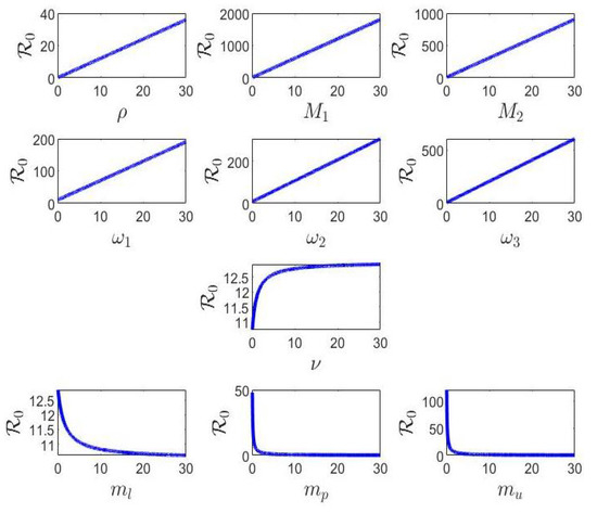 All diseases progress over time. This evolution is described in the disease’s mathematical modeling by variables and parameters. In this evolution, it turns out that certain parameters influence its propagation more than others. The sensitivity analysis of Model (1) was carried out in order to estimate the impact of the variation of certain parameters on the model predictions [22,23,24]. If the index describing the impact of a parameter on the model predictions is positive, then an increase of the value of the parameter induces an increase of , and if the index is negative, then an increase of the value of the parameter induces a decrease of [24].