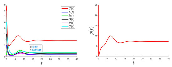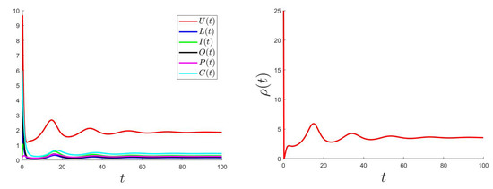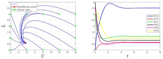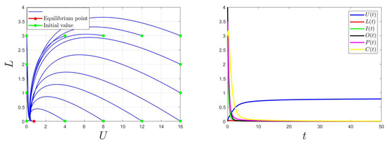 Similarly, for , then , the trajectory of the model (1) converges to (Figure 3). Thus, the global stability of the equilibrium point is when . This confirms the findings of Theorem 2.