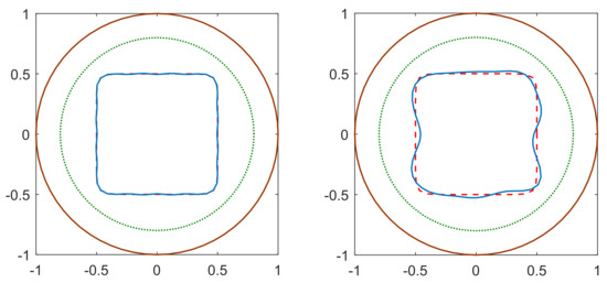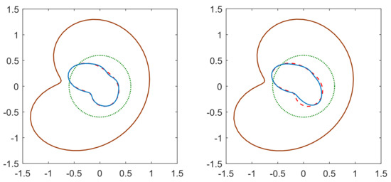 In both examples, the initial guess is a circle with center and radius We set and we use Fourier coefficients and we solve at the nodal points with In the following figures, the brown solid line represents the boundary the green dotted line shows the initial guess, the red dashed line is the exact boundary and its reconstruction is the blue solid line.