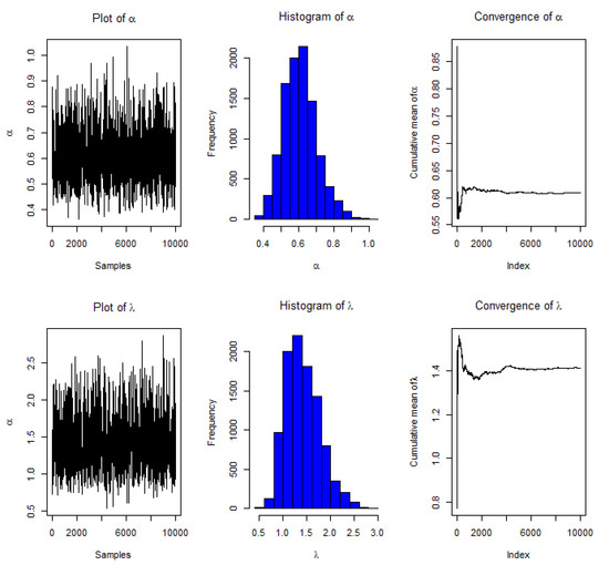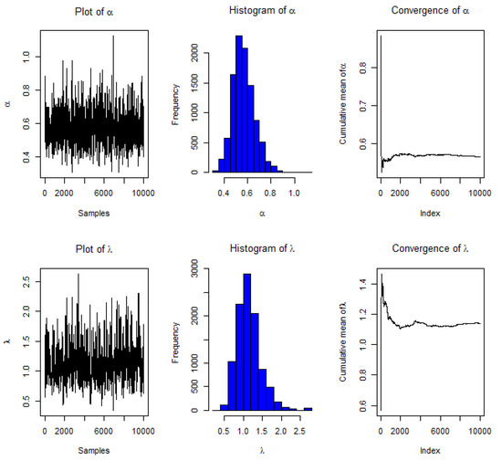The aforementioned informative prior values are used to compute the required estimations. When using the MH approach, we use the MLEs as starting guess values, as well as the corresponding variance–covariance matrix of . Subsequently, we removed 2000 burn-in samples from the total 10,000 samples generated by the PD, and then used the approach to derive BEs and HPD interval estimates of [23].