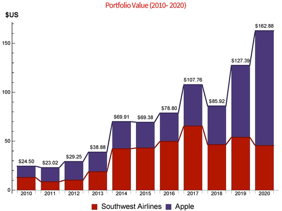 Some of the results are shown in Table 5 for pairs trading. After a very high probability reading for 26 February 2020, we can conduct the trading. To illustrate further, we see the very high probability; then, by taking equal weighted positions, we long the NASDAQ:AAPL index and short the NYSE:LUV index on 27 February 2020. We close the position at the end of the day, producing a total return of 5.136%. Similarly, we can employ this pairs trade method to the entire sample and illustrate the resulting profit and loss.