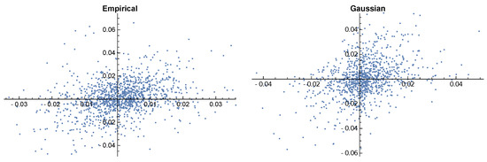 In this work, the implementations were conducted using Mathematica 12.0 [19] (Chapter 7) with a computer equipped with Core i7-9750H and SSD memory. It is necessary to check the effectiveness of the derived Gaussian copula under the marginal Laplace distribution. For this purpose, in Figure 3, the empirical data of the two stocks are compared with random numbers generated using the Gaussian copula function with the fitted marginal Laplace distribution. The results show how well the revisited copula works for fitting financial data. This distribution is fits stock market returns better, and it allows professionals working in the industry to obtain a more realistic expectation of daily returns.