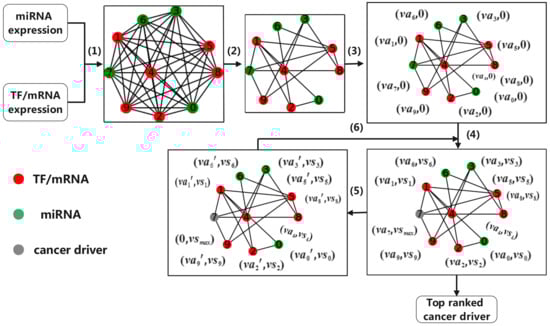 Figure 1. An illustration of identifying cancer driver. (1) Calculating Pearson’s correlation coefficient between genes; (2) Refining network; (3) Initializing voting ability; (4) Voting according to voting mechanism; (5) Updating voting ability; and (6) Repeating step (4).