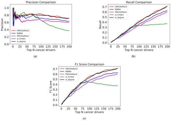 Figure 2. Performance comparison among PHVoteRank, NIBNA, HWVoteRank, w_hindex, and w_degree in top 200 predicted cancer drivers, excluding genes without mutations. (a) is the precision comparison, (b) is the recall comparison, and (c) is the F1 score comparison.