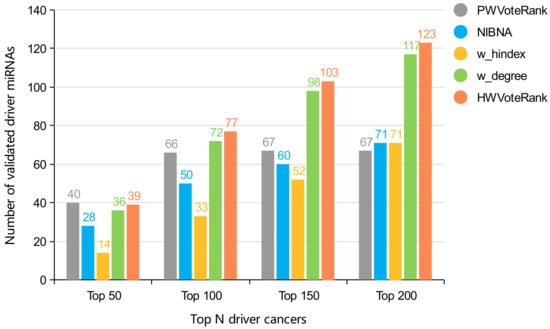 In order to prove the performance of HWVoteRank in detecting cancer drivers in cancer-specific networks, we compared HWVoteRank with CBNA [14] and NIBNA [15], which are currently efficient methods for identifying both coding and non-coding cancer drivers based on expression data. Some well-known methods for identifying key nodes in weighted networks include weighted degree [41], weighted H-index [42], weighted coreness [43], and weighted betweenness [44]. We also compared HWVoteRank with weighted degree (w_degree), weighted H-index (w_hindex), and improved WVoteRank [34] (called PWVoteRank in this paper) that has excellent performance in identifying key nodes in a weighted network (by voting approach). As weighted coreness and weighted betweenness need to traverse all paths from each node to other nodes in the network, they have very high computational complexity and are not suitable for large biological information networks. In additional, according to the comparison results of [42], weighted degree is better than weighted coreness and weighted betweenness, so we did not compare HWVoteRank with weighted coreness and weighted betweenness. As CBNA cannot rank identified cancer drivers of miRNA (it just ranks genes by mutation frequency), we only compared HWVoteRank, NIBNA, PWVoteRank, w_degree, and w_hindex by the validated number of cancer drivers, precision, recall, and F1 values among the top 200 identified cancer drivers, excluding genes without mutations. The results are shown in Table 1 and Figure 2. Clearly, HWVoteRank, proposed in this study, achieves the highest performance in exploring cancer drivers of coding mutated gene and non-coding miRNA. We found that the performance of w_degree is second only to ours, because as there is no experimentally confirmed miRNA–miRNA association in cancer-specific network, the absence of edges between miRNA nodes reduced the influence of rich club phenomenon on the performance of w_degree.